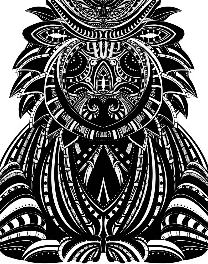I started with my pen and ink artwork, “Alien Speciman” Next I cropped the image, copied it, flipped it horizontal, and thought, “Huh, that looks kind of like a bear.” But it lacked ears and paws, so I added them in digitally. Then I thought, “Kind of looks like a lion, without the mane.” So I added a mane. End result… Lion Bear. Which looks pretty cool under a black light.